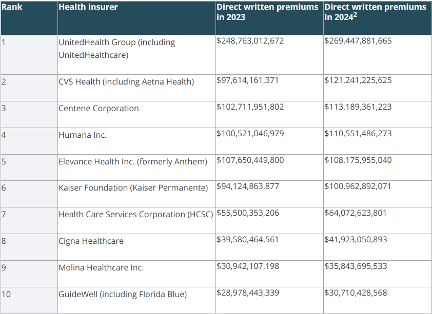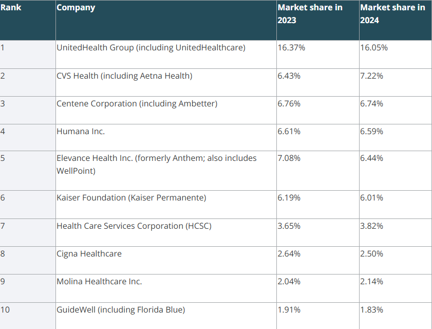Which health insurance companies are the largest in the U.S. by market share in 2024.